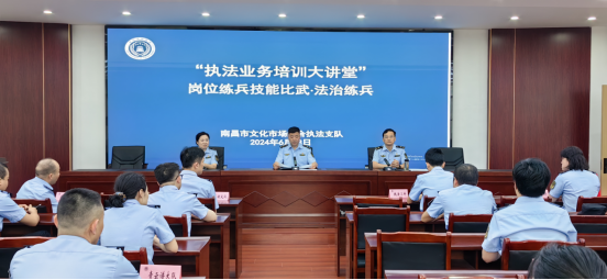 “执法业务大讲堂”活动,由文化部师资库老师、支队各科室、大队业务骨干进行授课,并组织全体执法人员通过全国文化市场技术监管与服务平台中“岗位练兵技能竞赛”专栏、江西省执法资格在线考试系统开展执法业务自学和组织测试。为鼓励执法人员发挥才能,支队将人才选拔培养与干部推荐使用结合起来,将练兵比武和抽考成绩纳入年度评优评先、绩效考核依据,将参加技能比武获奖者,列入支队人才专家库后备人选。