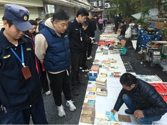 二、全面清理,严肃整治。仿古街周末集市流动摊贩无固定经营场所,无出版物经营许可,所售出版物未经合法授权和监管,可能包含大量错误信息、低俗内容甚至有害思想。针对他们周末早市出摊,掐准时间撤离等特点,执法人员及相关工作人员周密部署,每周末清晨到仿古街区域开展执法行动,经过执法人员的不懈努力,截至目前共出动执法人员50余人次,劝离流动摊贩20余个,收缴非法出版物100余本。整治行动初步遏制了仿古街游商摊贩无证经营出版物的现象,文化市场的整体环境得到了显著净化和改善。