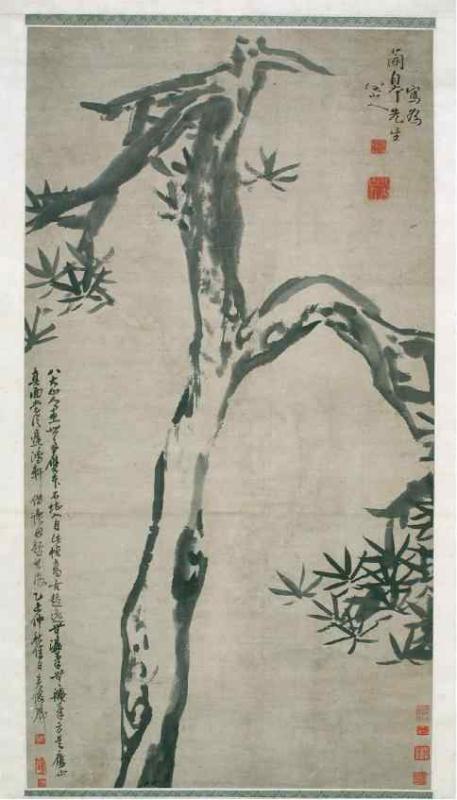 八大山人一生坎坷,“八大山人”四字蕴藉着他复杂的思想情感,四字联缀,类哭之笑之。世人从八大山人作品中体味到明显的禅味,清、幽、寒、静,自然适宜、浑然天成、平淡天真。而从凝练的形象、菁萃的笔墨中也无不感受到徘徊悱恻的吁叹,冷逸的表象下蕴含着突奔的情感。八大山人以水墨大写意著称,在艺术上卓尔不群,自辟蹊经,形成自我独特新貌。他所绘松,其干中粗下细,形成奇异张力;画石,其体上大下小,仿佛随时可动;画鸟,其形则缩颈鼓腹弓背露一足,特立独行。他使画中鱼鸟有了各种人的表情,或惊慌、或孤傲、或沉思、或悠然自得,神态稚拙,意趣盎然。“墨点无多泪点多”,尽量以最精简的笔墨表现最丰富的意蕴。至于构图,则尽最大可能利用空白,或在通幅画上只画一鱼一鸟、一花一石,从而在虚无中呈现海阔天空、云横雾动和生命的呼吸,同时也呈现了“超于象外”的意境。