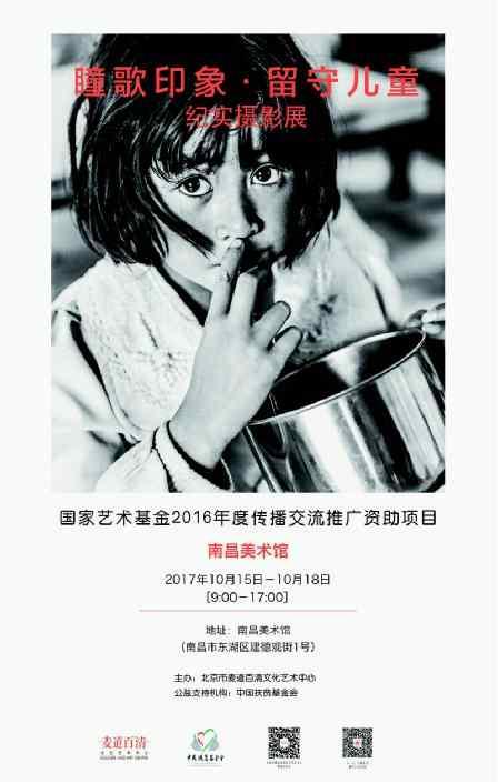 国家艺术基金2016年度传播交流推广资助项目 “瞳歌印象·留守儿童” 纪实摄影巡展活动具有连贯性和持续性,摄影巡展分别为北京、上海、成都、昆明、南昌、贵阳、深圳、石家庄、太原、呼和浩特等10个城市展出,以公益活动为实际支持的原则,唤醒人们对于贫困儿童、留守儿童的关注。