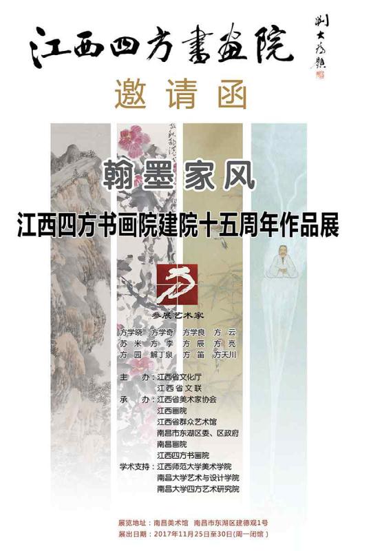 由江西省文化厅、江西省文联主办,江西省美术家协会、江西画院、江西省群众艺术馆、南昌市东湖区区委、区政府、南昌画院、江西四方书画院联合承办的“翰墨家风——江西四方书画院建院十五周年作品展”将于2017年11月25日在南昌美术馆开展。