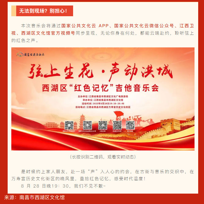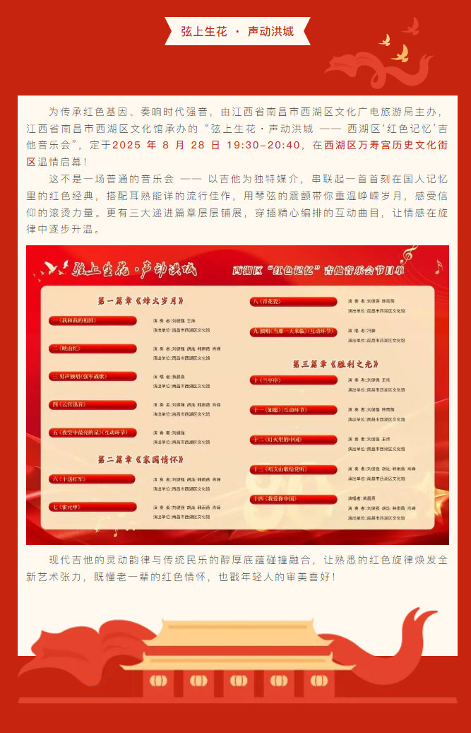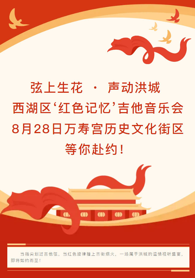 【县区动态】弦上生花 ・ 声动洪城 —— 西湖区‘红色记忆’吉他音乐会”,8月28日万寿宫历史文化街区等你赴约!