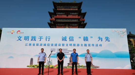 9月28日上午,2025年“文明践于行,诚信‘赣’为先”江西省旅游诚信省建设暨文明旅游主题宣传活动在滕王阁隆重举行。宣传活动由江西省文化和旅游厅主办,江西省文化和旅游市场调查监测中心、南昌市文化广电旅游局联合承办,南昌市文化市场综合执法支队协办。福建省文化和旅游质量标准化建设中心、南昌出入境边防检查站及南昌市部分旅游企业代表共同参与。