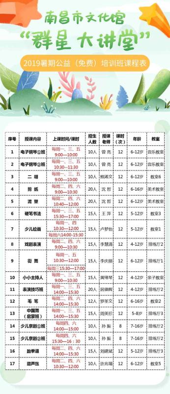 为切实贯彻落实《公共文化服务保障法》精神,保障广大市民的基本文化权益,丰富广大少年儿童的文化艺术生活。南昌市文化馆将于7月举办“2019年暑期少儿公益性(免费)培训班”,详情如下:
