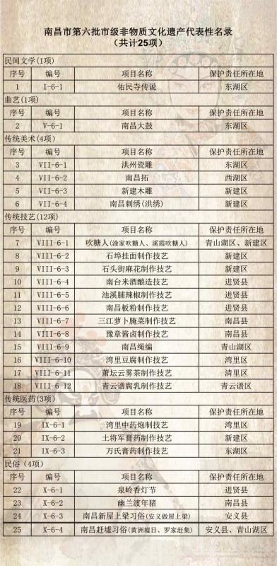 根据《中华人民共和国非物质文化遗产法》《江西省非物质文化遗产条例》精神,通过普查、申报、评审、公示,经市政府同意,公布南昌市第六批市级非物质文化遗产代表性名录(共25项,含保护责任所在地)。