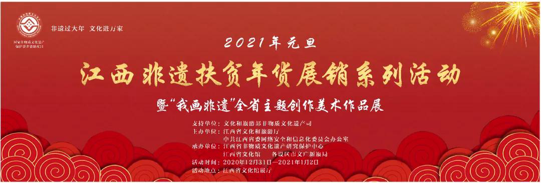 2020年12月31日至2021年1月2日,由文化和旅游部非物质文化遗产司支持,江西省文化和旅游厅、中共江西省委网络安全和信息化委员会办公室主办的“非遗过大年,文化进万家”——2021年元旦江西非遗扶贫年货展销系列活动暨“我画非遗”全省主题创作美术作品展将在江西省文化馆举办。