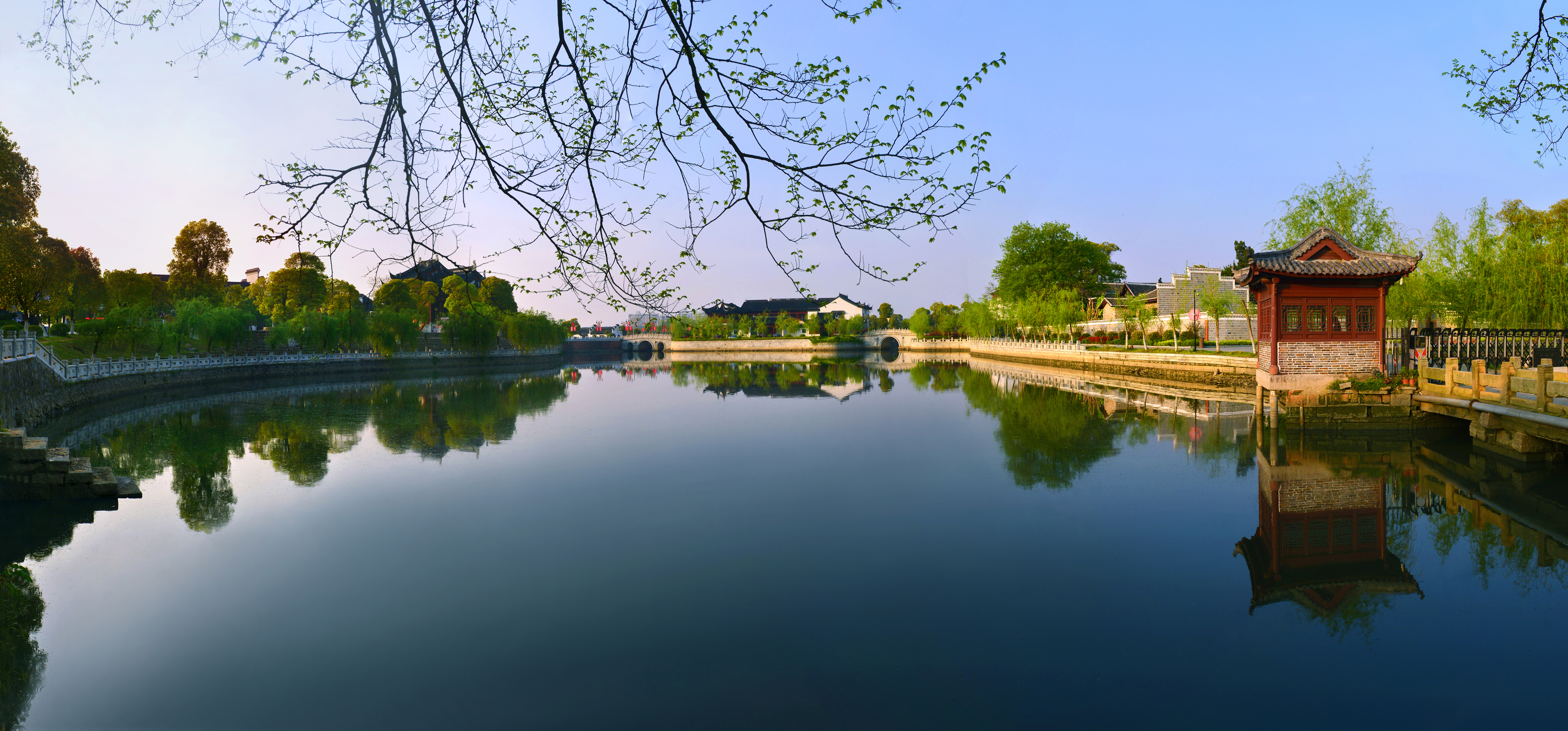 平静的湖面、古老的道观、遮天的大树、蜿蜒的长廊、绚烂的樱花,八大山人梅湖景区像一幅温婉秀美的山水画,勾勒出旖旎风光。