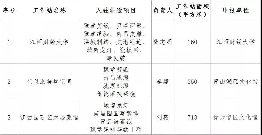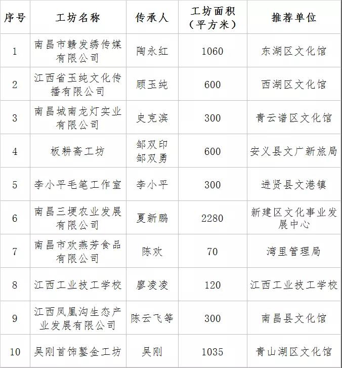 2021年12月12日,南昌市文化广电新闻出版旅游局根据《南昌市“非遗工坊”“传统工艺工作站” 认定管理办法(试行)》,组织专家对各县(区)申报推荐的工坊、工作站进行了评审和验收,拟定10个“非遗工坊”和3个“传统工艺工作站”,现予以公示。公示期间监督电话:0791—83986640。