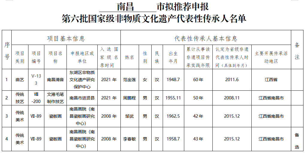 为贯彻落实《中华人民共和国非物质文化遗产法》《江西省非物质文化遗产条例》,根据江西省文化和旅游厅《关于印发〈江西省2021年度国家级(省级)非物质文化遗产代表性传承人传承活动评估工作方案〉的通知》要求,通过县区文化部门推荐,市文化馆(市非遗研究保护中心)组织实地评估、资料评估和走访评估,市文广新旅局审核,拟推荐范金莲(南昌清音)、周鹏程(文港毛笔制作技艺)、邹武(瓷板画)、李春敏(瓷板画) 等4人申报为第六批国家级非物质文化遗产代表性项目代表性传承人。