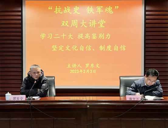 罗东文调研员以《学习二十大,提高鉴别力,坚定文化自信、制度自信》为题,围绕世界变局中的中国战略,结合生动的案例,深刻阐述了学习宣传贯彻党的二十大的重大意义。