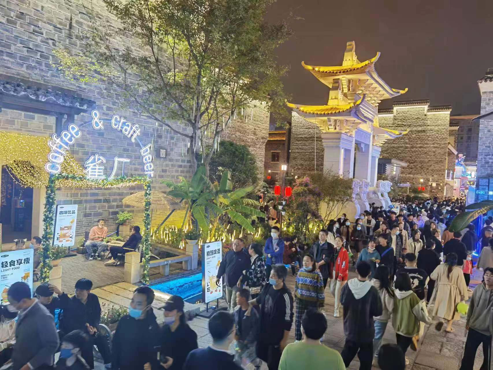 街区商户约110家,文购食娱住等业态齐备,有酒吧、餐吧、唱吧等,有全息投影灯光秀,吸引了大量年轻人前来打卡。至目前,年均游客接待量约1000万人次,单日最高游客量突破15万人次,年均营业总收入超过4.5亿元。