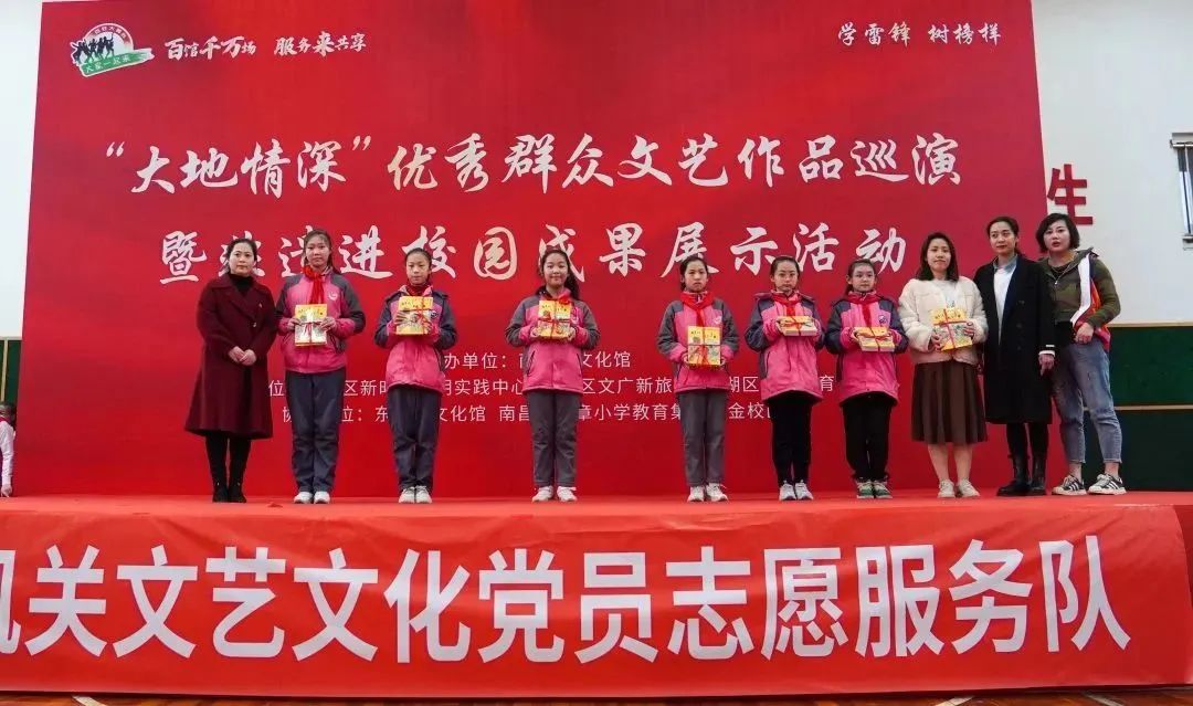 为弘扬“奉献、友爱、互助、进步”的志愿服务理念和志愿服务精神,3月3日,来自南昌市的文化志愿者们以学雷锋日为契机,以志愿服务为宗旨,在南昌市豫章小学紫金校区开展“学雷锋 树榜样”——“大地情深”优秀群众文艺作品巡演暨非遗进校园成果展示活动。