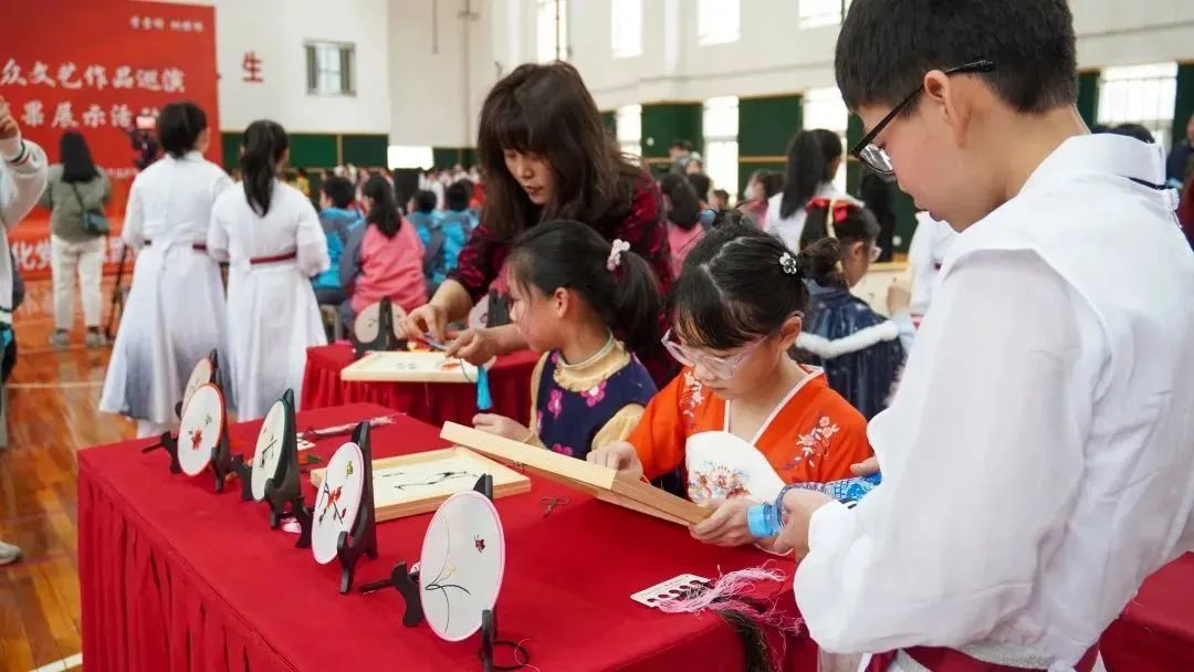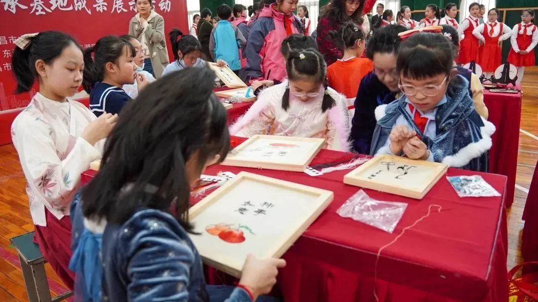 在非遗进校园成果展示活动中,南昌清音《红领巾》、少儿京剧《红灯记》《沙家浜》、方志敏故事《推进乡村振兴 迈向共同富裕》、楚调唐音《将进酒》等节目精彩纷呈,深受孩子们的喜欢。此外,现场还设置了非遗互动区,豫章绣、豫章刻瓷、南昌泥塑的传承人手把手传授非遗技艺,带领学生们体验非遗项目。