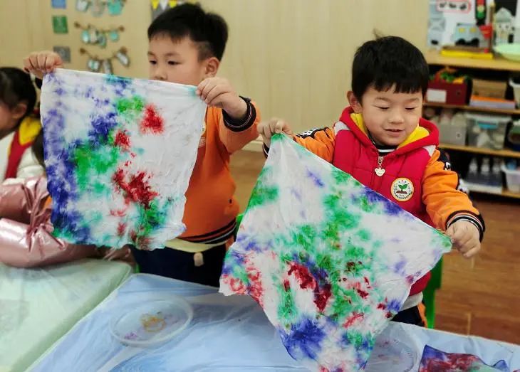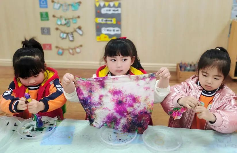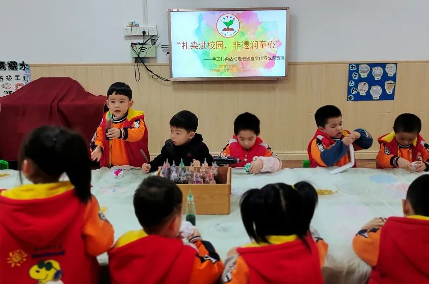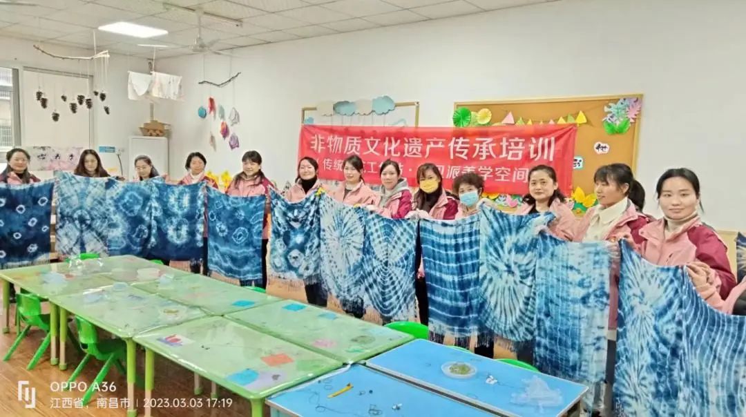 本次活动主题为手工扎染和幼儿彩染,有60多位师生参与体验。南昌市传统工艺工作站的老师首先给大家讲述了扎染的历史文化背景知识,介绍了植物染和现代染料的生产流程,接着为大家演示了手工扎染的10余种技法。
