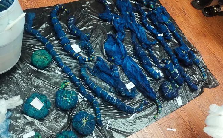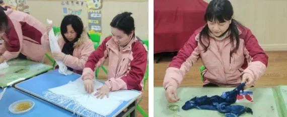 随后,大家在老师的指导下选择好图案,认真地完成捆扎、浸湿、调料、浸染,氧化、漂洗、脱水等步骤后,一条条色彩斑斓,图案各异的扎染作品就呈现了出来。