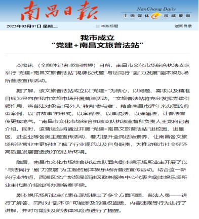 日前,南昌市文化市场综合执法支队举行“党建+南昌文旅普法站”揭牌仪式暨“与法同行 ‘剧’力发展”剧本娱乐场所普法宣传活动。