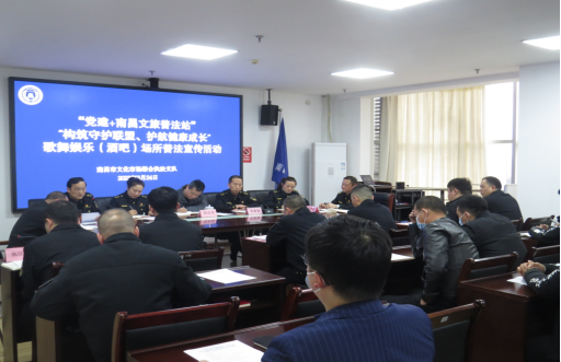 为贯彻落实《未成年人保护法》、《预防未成年人犯罪法》等文件精神,加强青少年权益保护,织牢织密未成年人健康成长“保护网”,严格落实歌舞娱乐(酒吧)场所主体责任,积极推动涉未成年人问题监管常态化、长效化,最大限度为未成年人提供全方位法律保护,为青少年健康成长营造良好的社会环境。3月24日,南昌市文化市场综合执法支队“党建+南昌文旅普法站”举办“构筑守护联盟、护航健康成长”歌舞娱乐(酒吧)场所普法宣传活动。南昌市文广新旅局政策法规科科长曾而明同志、南昌市文化市场综合执法支队班子成员、各派出大队负责人,7个城区歌舞娱乐(酒吧)场所业主代表,共计60余人参加了普法宣传活动。