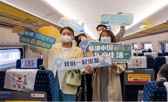 4月28日,由昆明铁路局集团公司打造的“5·19中国旅游日”主题高铁列车从昆明发车前往北京,车身喷绘“5·19中国旅游日”标志及活动主题,车厢内营造“5·19中国旅游日”主题氛围,化身为飞驰的宣传员。5月,主题高铁列车将持续运行,让全国各地旅客感受到浓浓的节日氛围,扩大活动的影响力和覆盖面。