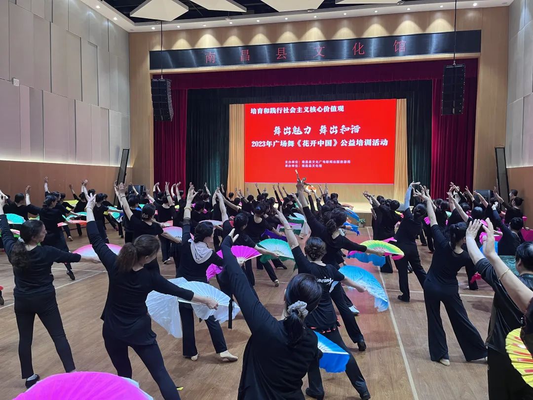 为不断提升公共文化服务体系建设,促进全民艺术普及高质量发展,深入推进群众性文化活动健康开展,不断满足人民群众对幸福美好生活的追求,充分展示广场舞爱好者的风采,激发健康美丽、昂扬向上的精神风貌。5月15日下午,由南昌县文化广电新闻出版旅游局主办,南昌县文化馆承办的培育和践行社会主义核心价值观“舞出魅力 舞出和谐”2023年广场舞《花开中国》公益培训活动在昌南文化中心1号馆小剧场圆满结束;来自各社区、乡镇、街道及各民间艺术团文艺骨干共计100余人参加了此次培训。