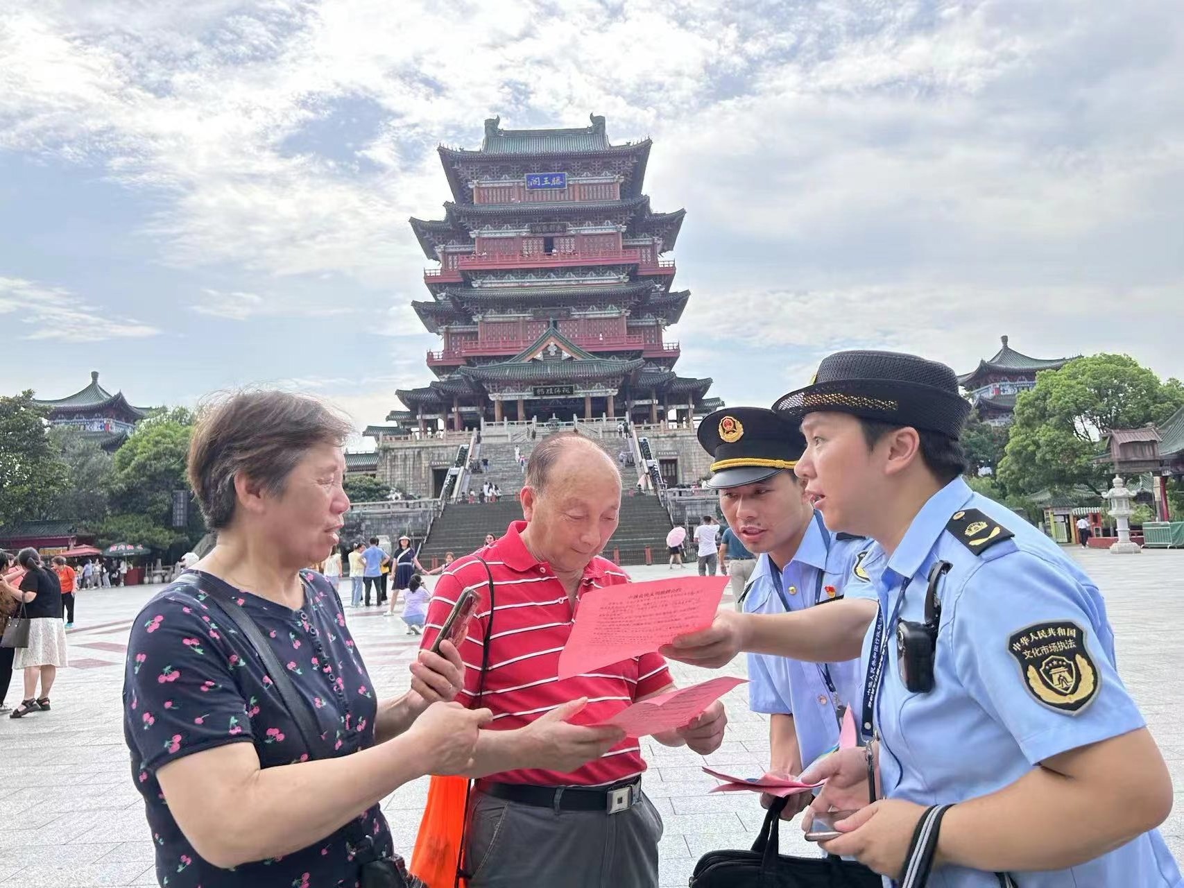 “出去玩要自觉遵守《中国公民国内旅游文明行为公约》”“参团旅游,选择有资质的旅行社,签订好旅游合同,安全出行。”6月30日,南昌市文化市场综合执法支队执法人员顶着烈日、身着制服在国家"5A"景区滕王阁广场正耐心地与游客交流着。