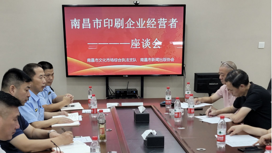 为进一步了解疫情后我市印刷企业的经营状况和实际困难,宣传印刷行业法律法规,促进我市印刷企业在规范的基础上良好复苏,7月25日,市文化市场综合执法支队支队长刘曦带领执法人员,走访南昌市新闻出版协会,并与协会企业代表座谈。通过座谈,问需于企,问计于企,从而更好地加强监管。