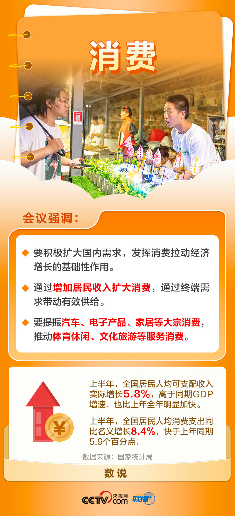 消费是畅通国内大循环的关键环节和重要引擎,也是人民群众对美好生活的直观需求。本次会议强调,“要积极扩大国内需求,发挥消费拉动经济增长的基础性作用”,再一次把扩大消费摆在了重要位置。同时,会议紧扣消费升级的趋势和方向,强调要提振汽车、电子产品、家居等大宗消费,推动体育休闲、文化旅游等服务消费。