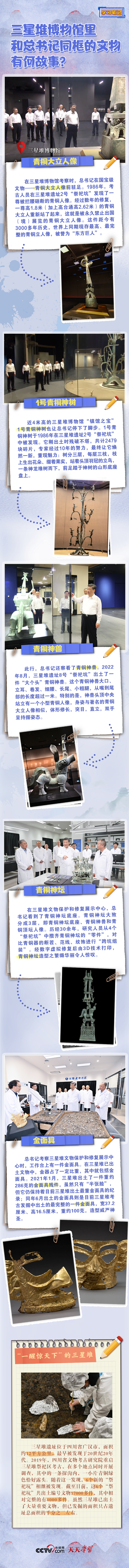 7月26日下午,正在四川考察的习近平总书记来到三星堆博物馆,了解历史文化遗址发掘研究、文物保护修复等情况。记者的镜头捕捉到了总书记和青铜大立人像、1号青铜神树、青铜神兽、青铜神坛、金面具等珍贵文物的同框瞬间。央视网《天天学习》与您一起了解这些文物。
