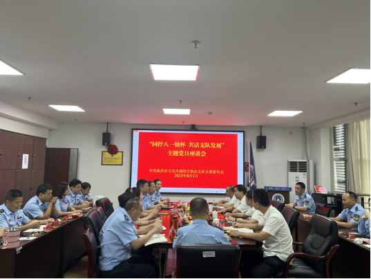 为庆祝中国人民解放军建军96周年,关怀和激励广大退役军人发扬优良传统、实干担当作为,8月1日下午,南昌市文化市场综合执法支队召开“同抒八一情怀,共话支队发展”庆“八一”座谈会暨支部主题党日活动。局党组成员、副局长宋国平莅临指导,支部书记、支队长刘曦主持座谈会,支队领导班子及转业干部近20人参加。