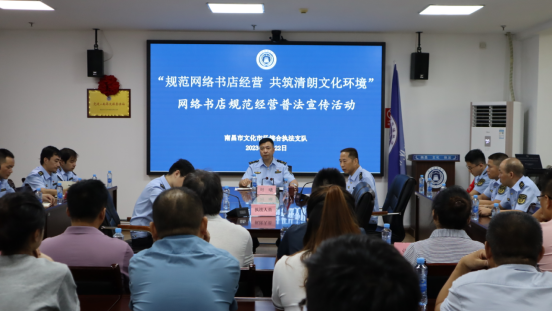 为进一步提升网络文化市场经营者的法律意识和法治观念,规范网络书店经营,营造积极健康清朗的网络文化环境。8月22日上午,南昌市文化市场综合执法支队对我市40余家网络书店经营单位开展了第一期“面对面”的集中普法宣传活动。市文化市场综合执法支队支队长刘曦参加活动并讲话,副支队长邹爱强主持。