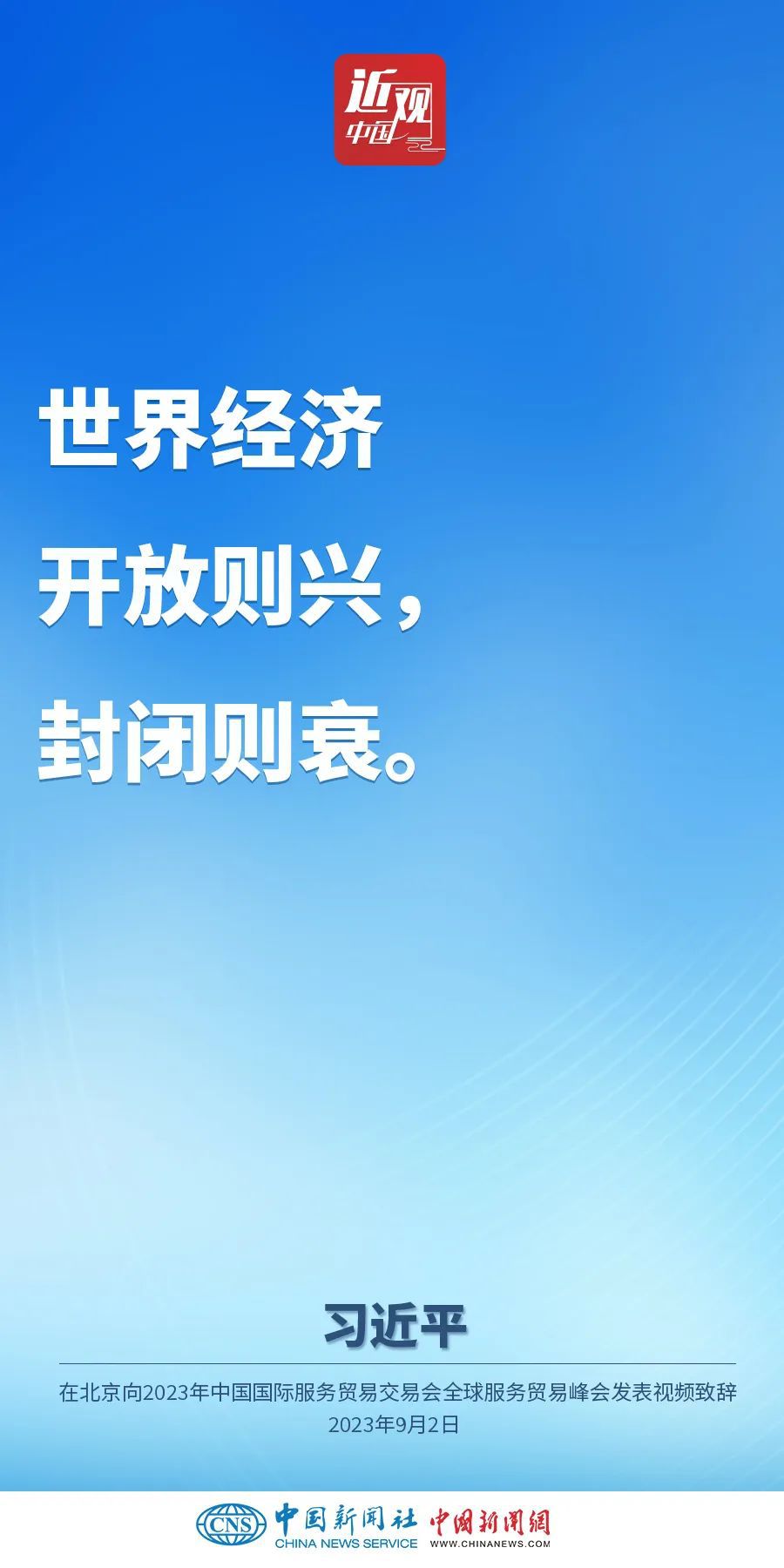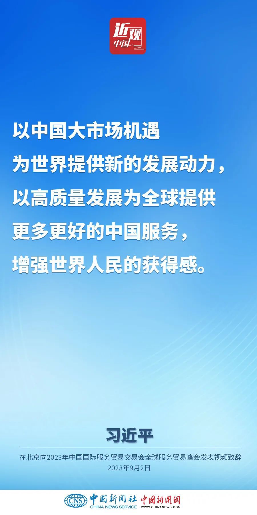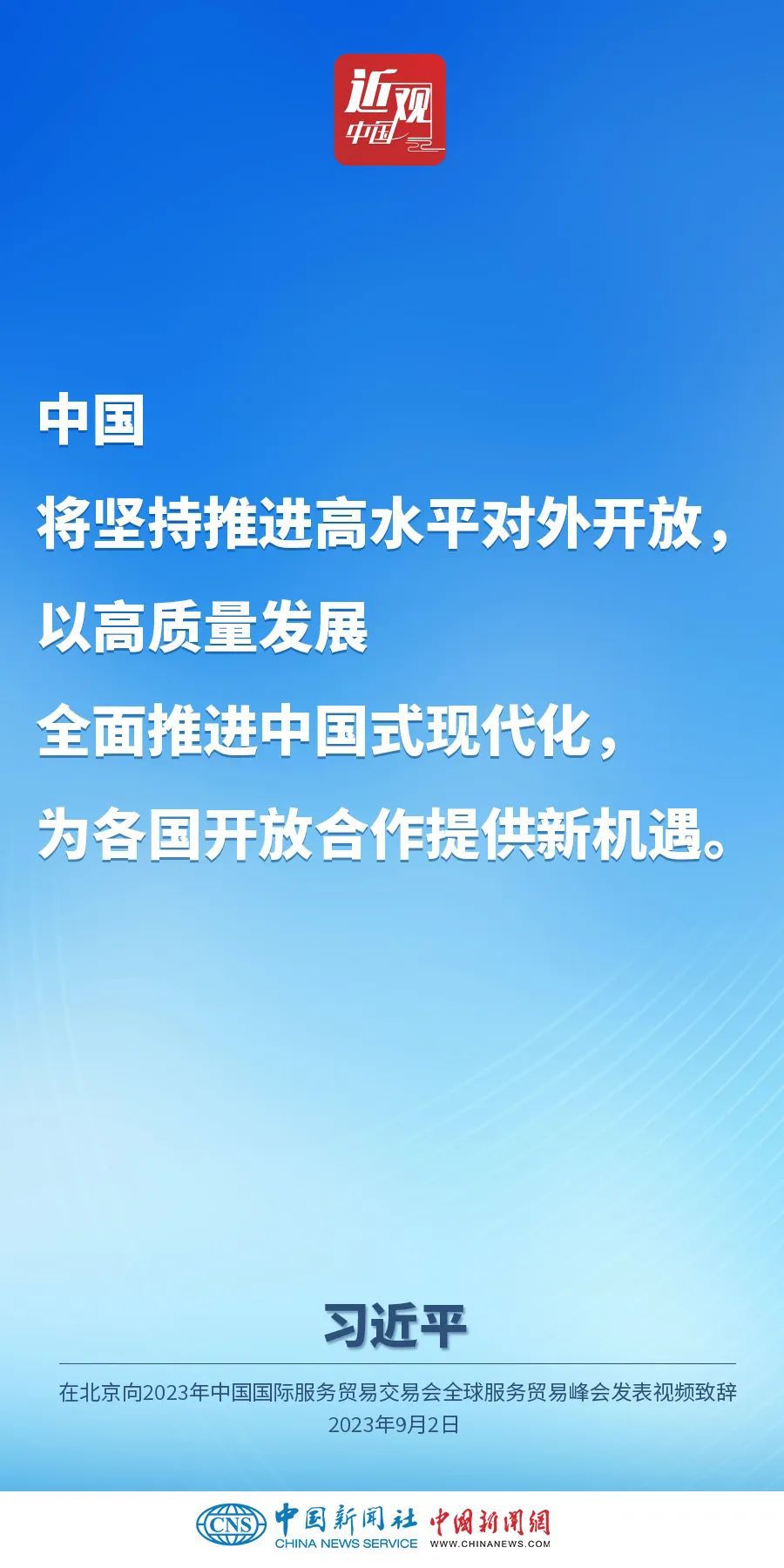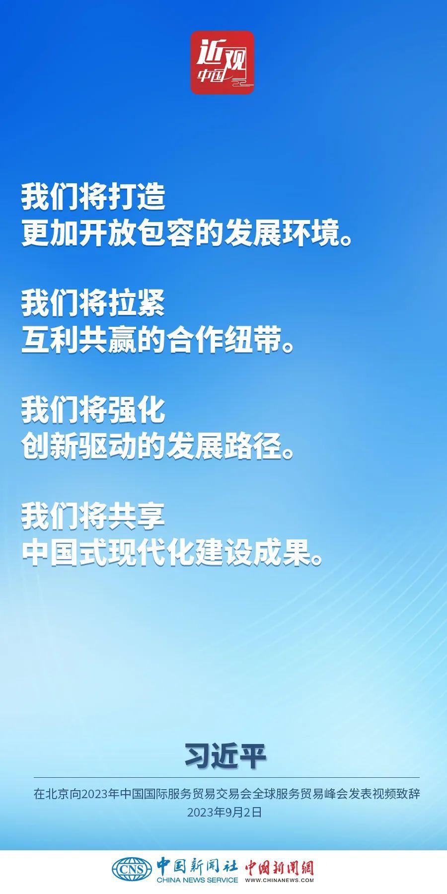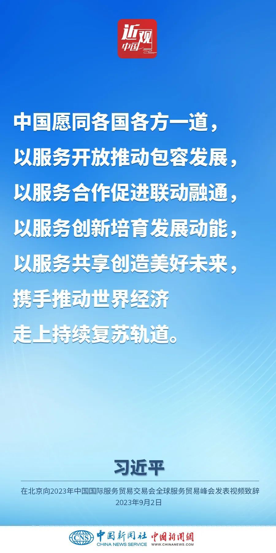 9月2日上午,中国国家主席习近平在北京向2023年中国国际服务贸易交易会全球服务贸易峰会发表视频致辞。他指出——