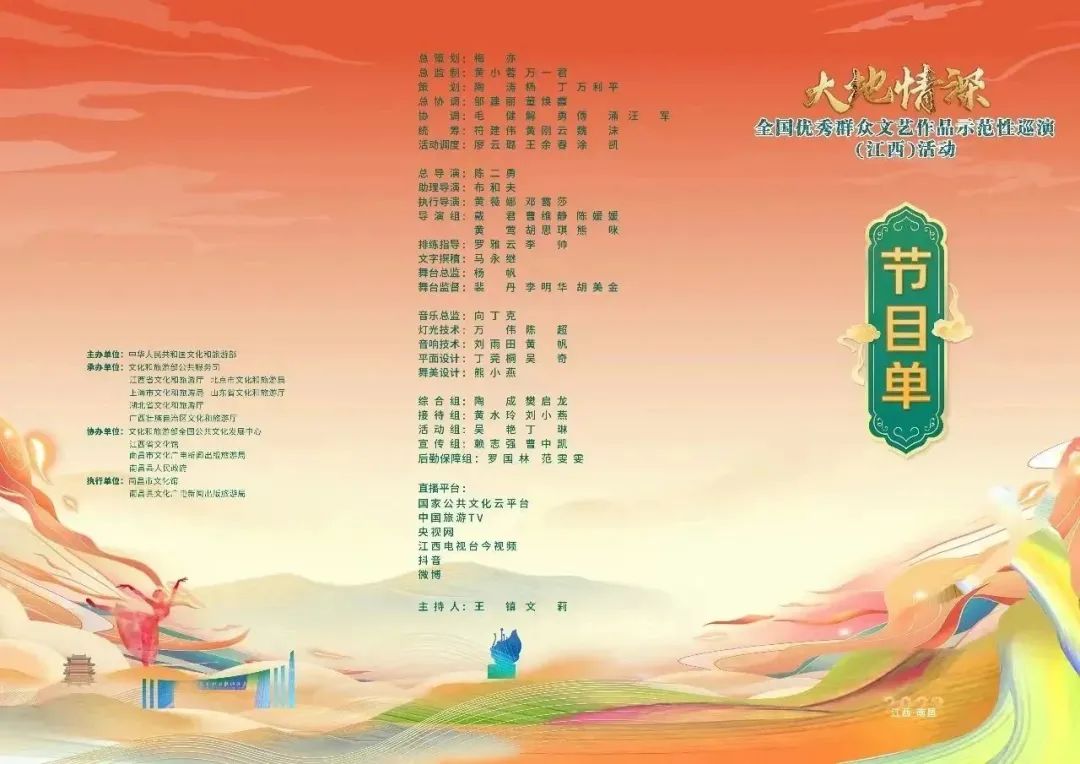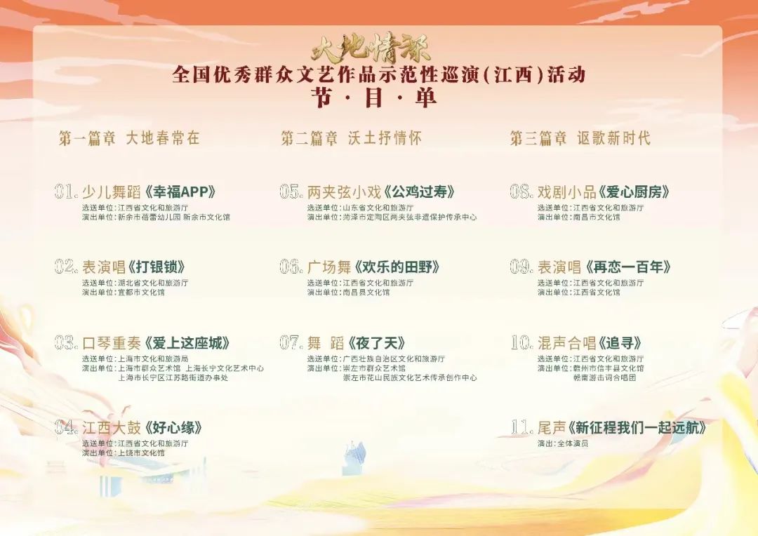 为进一步实施文化惠民工程,丰富城乡群众节日文化生活,满足群众精神文化需求,全面推动群众文化工作繁荣发展,“大地情深”——全国优秀群众文艺作品示范性巡演(江西)惠民专场暨“我们的节日——喜迎中秋·国庆”文艺汇演活动将于2023年9月28日晚19:30在南昌县澄碧湖北广场举行,来自上海、广西、山东、湖北及江西本土的10个群众文艺精品将亮相舞台,把群众文艺浓浓的“时代性”“烟火气”“人情味”呈现给观众,为广大市民带来一场高水准的文化艺术盛宴。
