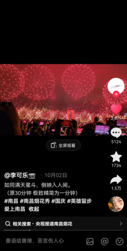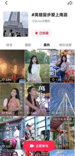 自“英雄留步·爱上南昌”城市漫游计划正式上线后,活动在抖音、小红书、微信官方公众号等各大平台进行预热,吸引广大市民、游客积极参与。在上线短短2周时间内,共有小妮在江西、小草探店、少年郎、南昌打卡、吃货小芙等多位文旅达人参与本次活动,吸引超千万人关注。截至10月20日,抖音平台#“英雄留步 爱上南昌”城市漫游计划话题下共发布128个视频,播放量达1234.w,其中3个视频点赞量破万,浏览量破百万。