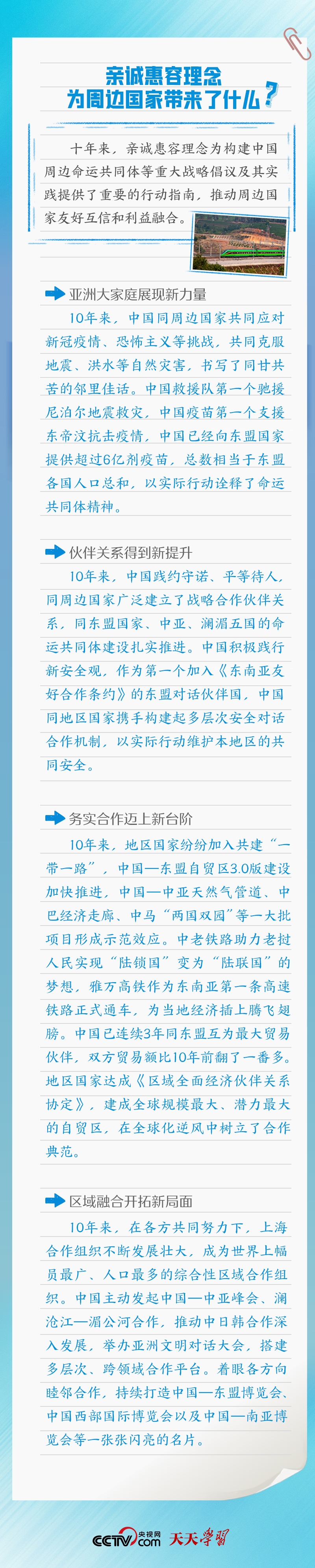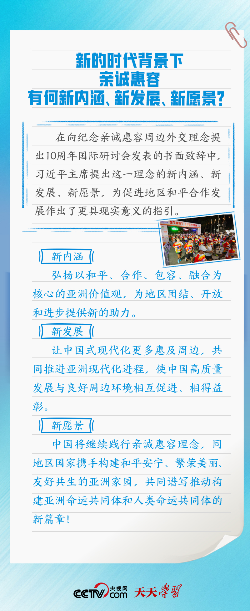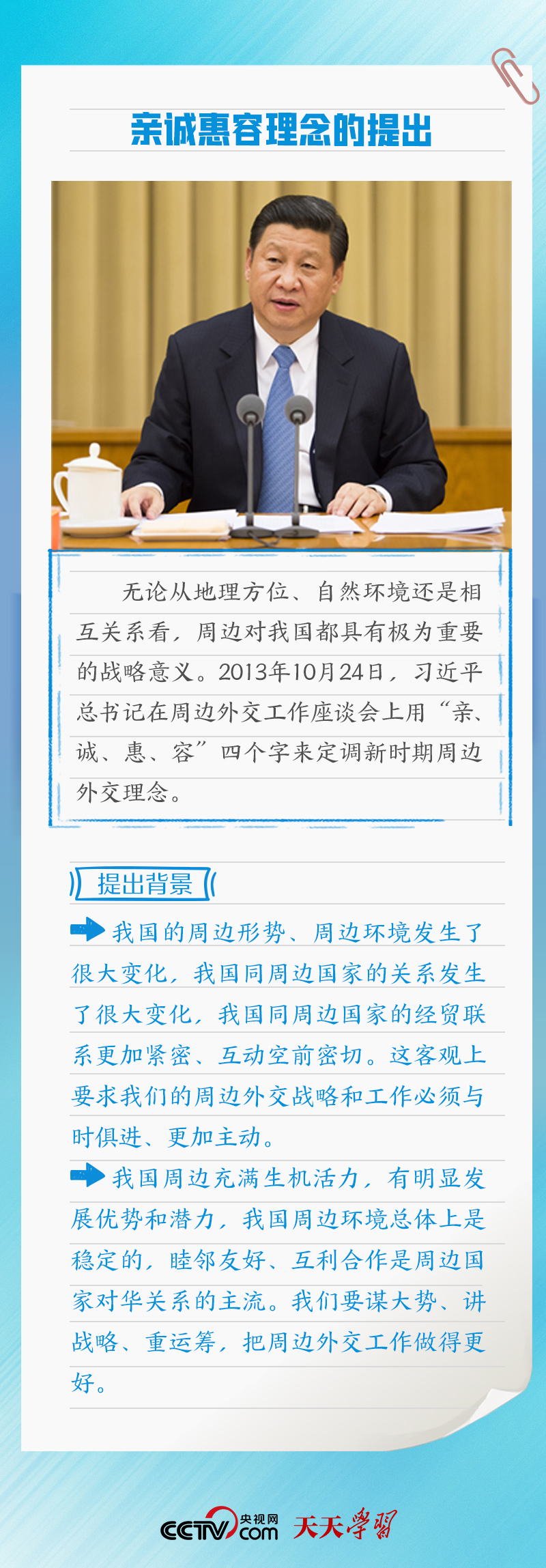 “亲诚惠容”理念,源自多年来中国周边外交实践,是新形势下中国坚持走和平发展道路的生动宣言。亲诚惠容理念有何重要内涵?如何践行亲诚惠容理念?央视网《天天学习》栏目特梳理相关内容,与您一起学习。