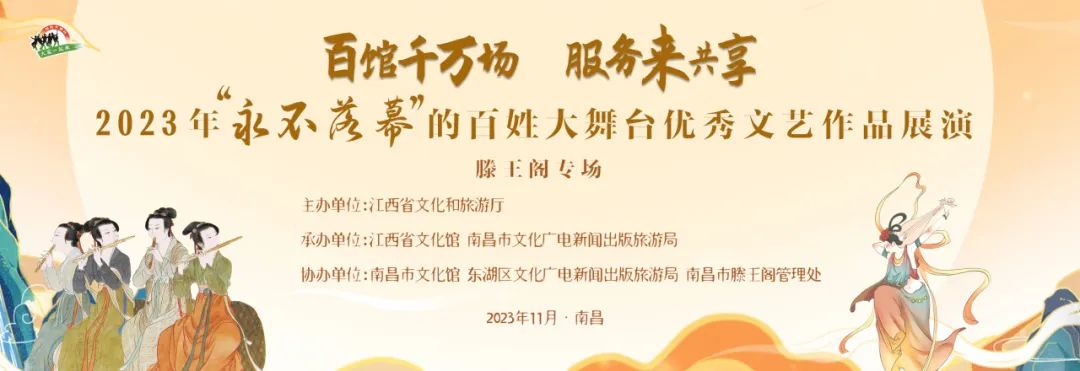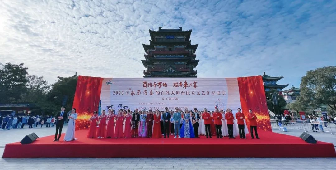 为全面贯彻落实党的二十大精神和习近平文化思想,习近平总书记考察江西重要讲话精神,繁荣发展社会主义先进文化,满足人民日益增长的精神文化需求,推进文化自信自强,11月18日下午,2023年“百馆千万场 服务来共享”——“永不落幕”的百姓大舞台优秀文艺作品展演在东湖区滕王阁景区精彩上演。该专场由江西省文化和旅游厅主办,江西省文化馆、南昌市文化广电新闻出版旅游局承办,南昌市文化馆、东湖区文化广电新闻出版旅游局协办,精彩的演出再一次掀起了本年度“永不落幕”的百姓大舞台优秀文艺作品展演活动的热潮。