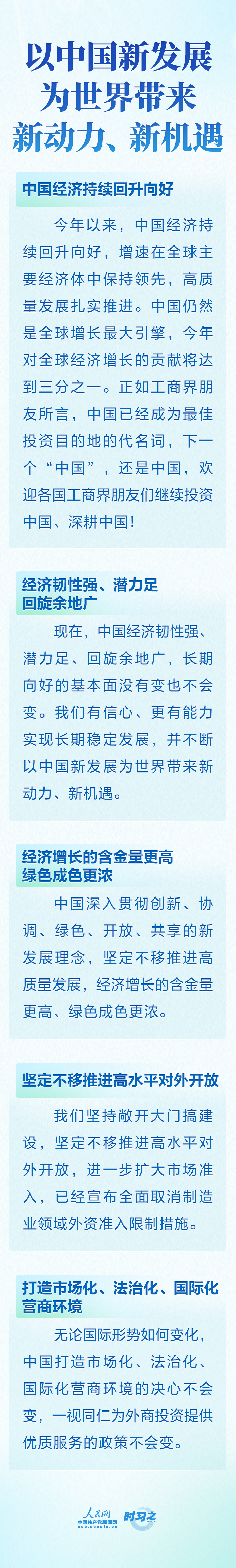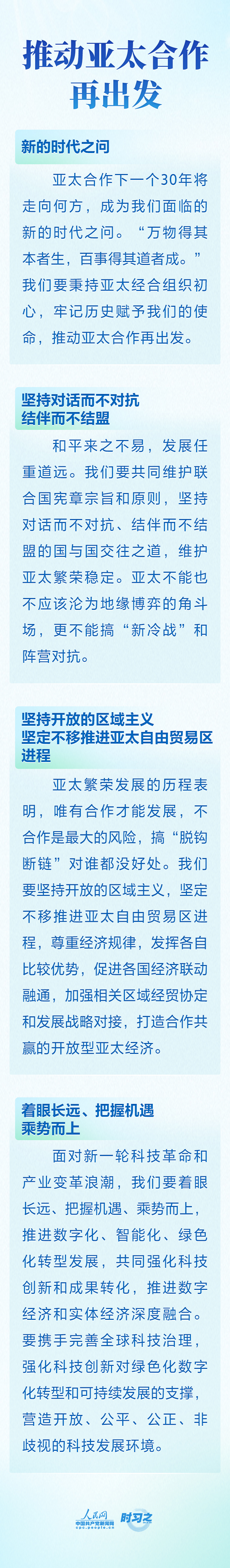 当地时间2023年11月16日上午,国家主席习近平向在旧金山举行的亚太经合组织工商领导人峰会发表题为《同心协力 共迎挑战 谱写亚太合作新篇章》的书面演讲。习近平主席围绕亚太合作的深刻启示、推动亚太合作再出发、中国新发展为世界带来的新机遇进行了深入阐述。