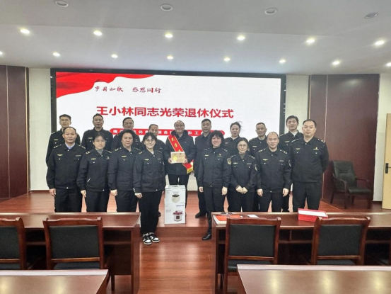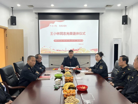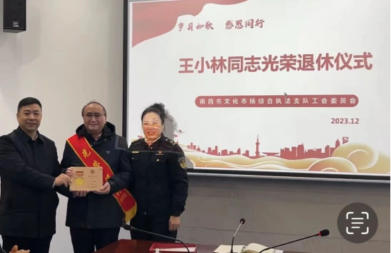 2023年12月12日上午,南昌市文化市场综合支队支队工会委员会为光荣退休的王小林同志举行荣退仪式。仪式由工会主席魏芳主持,支队领导班子、各科室负责人、工会委员等参加。