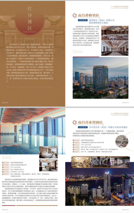 为落实《2023年南昌市“优秀旅游服务提升季”行动实施方案》工作部署,加强星级(绿色)旅游饭店产品宣传,精准提升游客体验感与满意度。南昌市文化广电新闻出版旅游局根据当下流行的数字化宣传品阅读浏览趋势,按照三县六区(含高新区、经开区和湾里管理局)的行政区划,收集整理最新星级(绿色)旅游饭店资讯,展示星级(绿色)旅游饭店的导航地址、预订信息、交通信息(公共交通)、停车信息与周边景点信息、接待容量、服务特色、品牌等级(如:五星级旅游饭店、金树叶级绿色旅游饭店等)等信息,创新推出“美住南昌”旅游饭店住宿指南电子书,为互联网渠道的来昌游客住宿预订提供指南性参考。