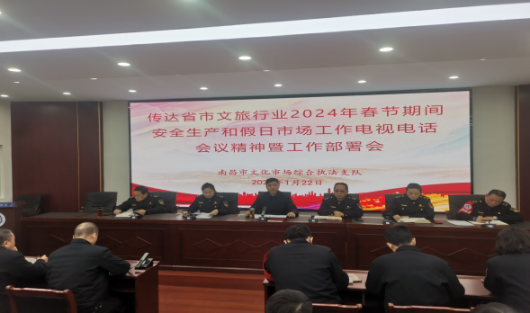 1月22日下午,南昌市文化市场综合执法支队召开全体会议传达省、市文旅行业2024年春节期间安全生产和假日市场工作电视电话会议精神暨工作部署会,支队长刘曦主持会议。