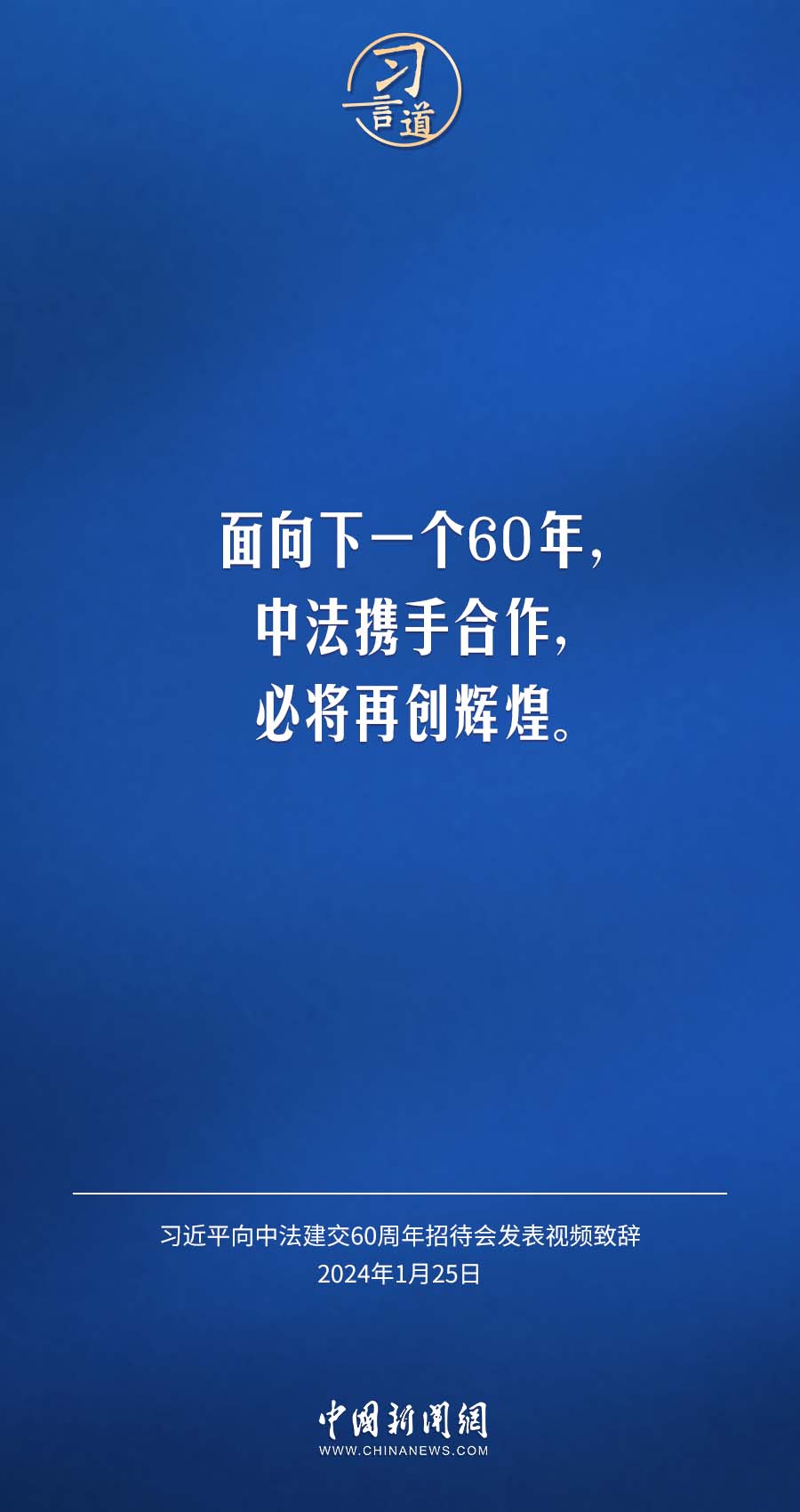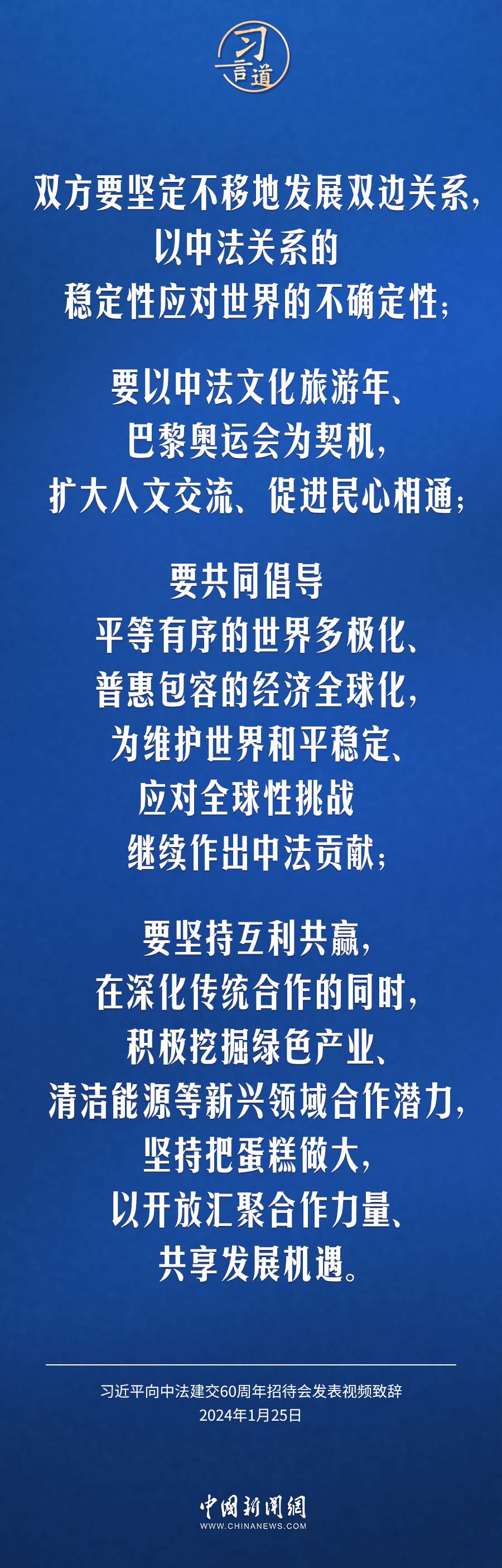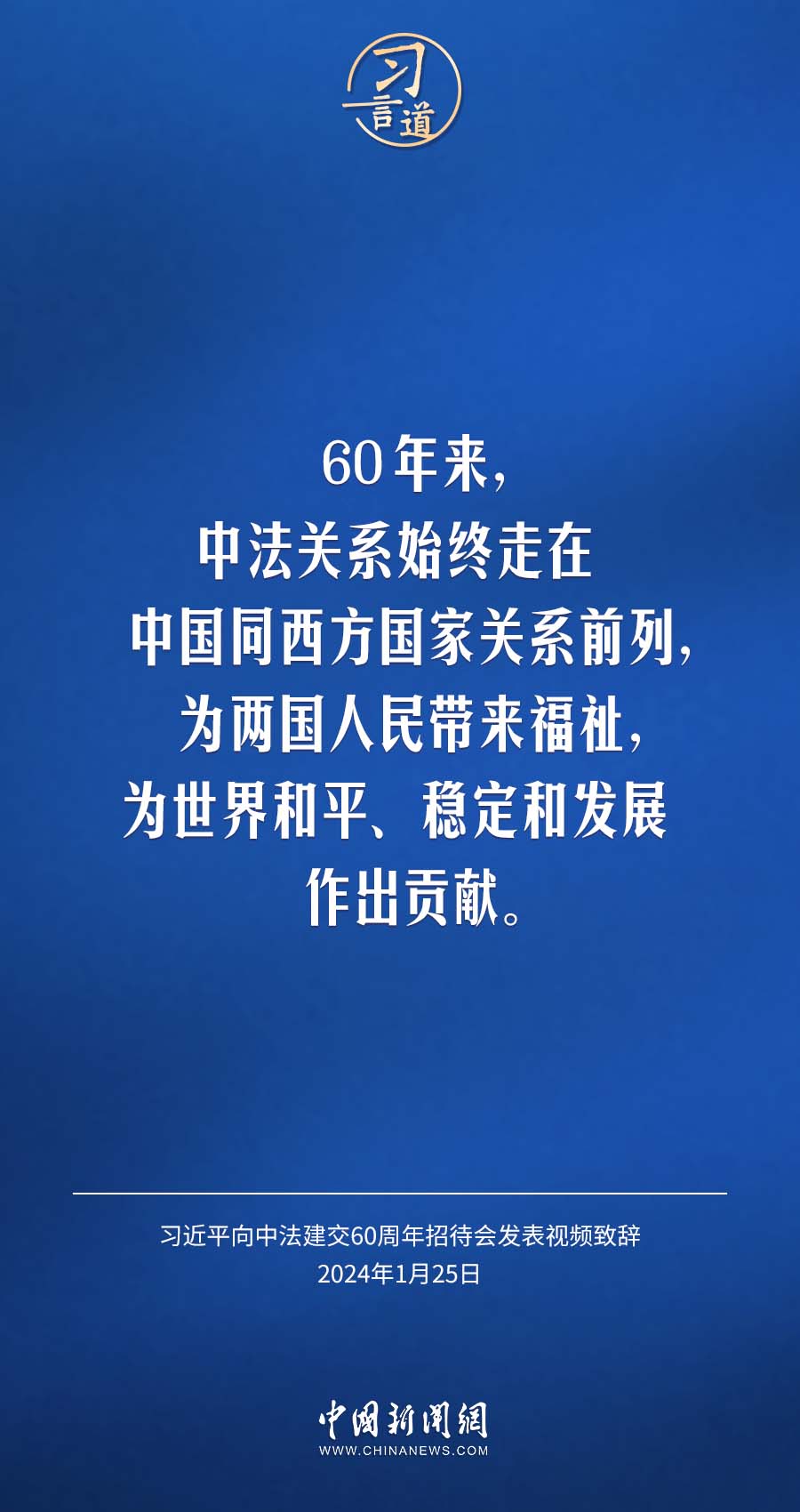 1月25日,中法建交60周年招待会在国家大剧院举行,国家主席习近平发表视频致辞。习近平指出——
