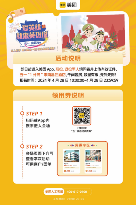 1.2024年4月28日上午10:00:00起,进入美团App搜索“五一南昌见”或者扫码,即可进入活动页面。
