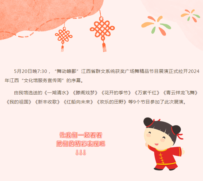 在未来一周,南昌市文化馆将围绕“文化馆服务宣传周”活动主题,以文化为媒介、城市为载体,开展一系列独具地方特色的群众文化活动。同时,我市各级文化馆也将借此机会加强与市民的互动和联系,推动全民艺术普及和文化艺术的繁荣发展,做实做细做深“家门口的文化服务”,持续提升市民获得感和满意度。